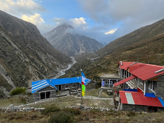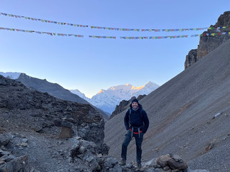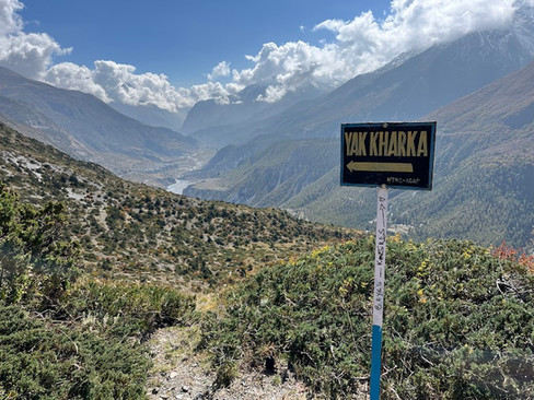 Our destination today was a settlement called Yak Kharka - with a name like this translating to ‘yak pastures’, we held high hopes of seeing some yaks! Our dream was fulfilled very quickly as we approached the abandoned settlement of Upper Khangsar. There was a large herd of yaks across the trail, and we weren’t sure whether to be excited or nervous to cross their paths. Luckily yaks are relatively docile and we passed without issue (after a few photos of course!). From the top of Upper Khangsar, we were greeted with sweeping views of the valley in one direction back to Manang, and the other up toward Tilicho Peak. It was a great perspective, and the perfect spot for a rest from the climb.