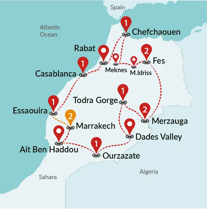 Morocco is a country built on layers of history, where centuries of different cultures have left their mark. Its Berber roots are still present in the mountains and villages, while Arab influence shaped its cities, religion, and architecture. Later, European powers, especially the French, added wide boulevards, orderly squares, and colonial-era buildings. Ancient trade routes once ran through the country, linking Africa, the Middle East, and Europe. Today, Morocco has a population of around 37 million people, with Arabic and Berber as the official languages (although French and Spanish are still widely spoken), and Islam as the predominant religion. From the modern, cosmopolitan streets of Casablanca to the maze-like alleys of Marrakech and the vast, silent stretches of the Saharan desert, Morocco’s geography, culture, and traditions offer an intriguing mix.