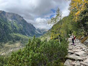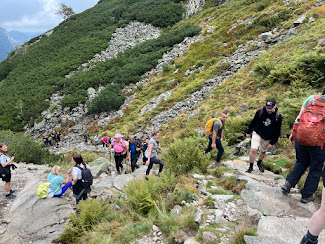 The sound of a rescue helicopter echoed through the valley, drawing our attention. It wasn’t surprising when we returned to the alpine lakes, when we encountered a massive crowd of people. As we continued toward the turnoff for our descent, the trail became even busier—a stark contrast to the solitude we had experienced the day before. While we had previously walked up a river of water, we were now navigating a river of people! With the Morskie Oko road closed due to the weather, this advanced trail was packed with day-walkers, many ill-equipped in jeans, sneakers, or even sandals. The narrow path left no room for waiting or passing comfortably, creating a chaotic atmosphere.